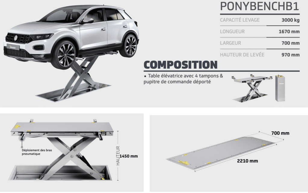 La table élévatrice Ponybench B1 Spanesi est équipée de 4 bras à ouverture pneumatique commandée au pupitre de commande déporté. La table élévatrice Ponybench B1, permet d’avoir un poste de travail rapide et ergonomique et apporte un confort optimal pour l’utilisateur (carrossier/mécanicien), pour la réalisation des travaux de démontage, remontage, ponçage et peinture.